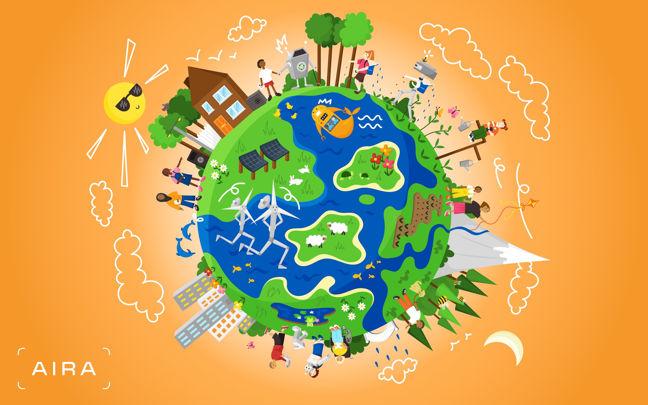 Working with clean energy tech company, Aira, on their Cleaner Future Campaign. After hosting a workshop with a group of young people at a London Wildlife Trust setting, I went on to create a mural design from their visions of clean, green future without pollution. The final product was used in their press pack.